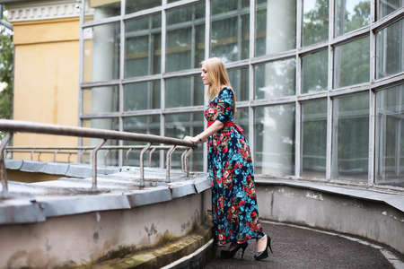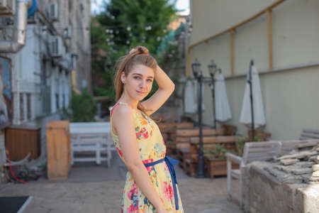 girl in dress walks through the old town in the summer. Beautiful blonde woman summer photo.