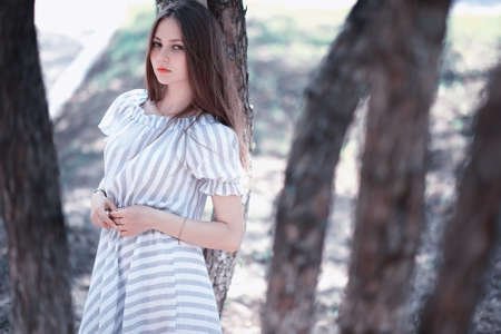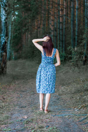 OMSK, RUSSIA, MAY 09, 2020: Girl in a dress in the evening in the forest. A charming lady enjoys nature during the sunset.