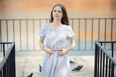 Model walk around the city and use posing. Sunny day. Summer.