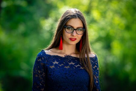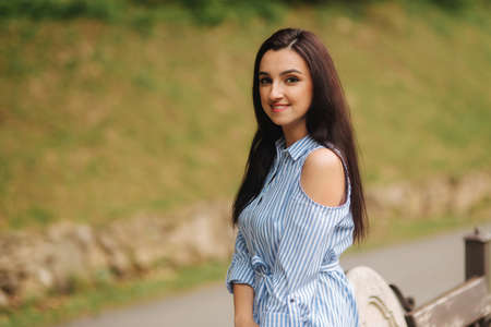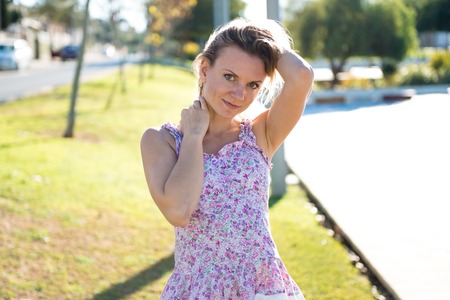Beautiful brunette woman posing outdoor sunny day