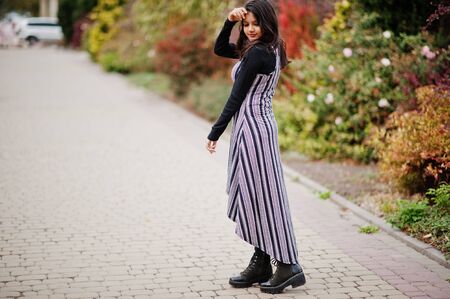 Portrait of young beautiful indian or south asian teenage girl in dress posed at autumn park in Europe.
