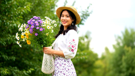 A woman wearing a straw hat and a white dress with floral patterns is holding a bouquet of colorful flowers. She is standing in a lush, green garden.