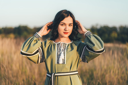Pretty brunette girl in long embroidery dress outdoor