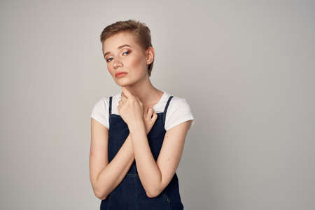 Slim sexy brunette girl wearing woman's denim overall over green tree wall texture in urban area