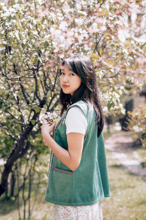 Young girl in ethnic traditional national Kazakh costume in spring garden