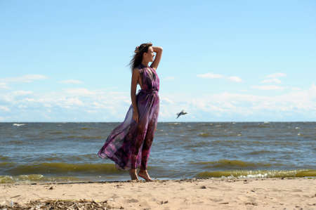Beautiful girl in colorful dress posing at the camera on the sea background