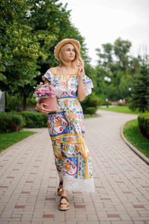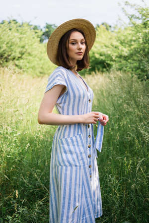 Young woman wearing light blue summer dress holding fashionable shoulder bag and yellow straw hat standing outside enjoying warm weather in summer park.
