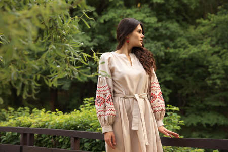 Beautiful woman wearing embroidered dress near wooden railing in countryside. Ukrainian national clothes