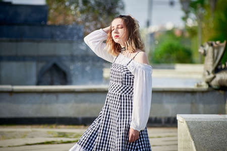 A beautiful young girl adjusts her hair and poses against the background of a fountain in a city park with her eyes closed. Close-up