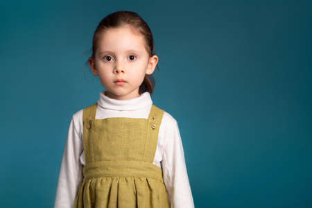 Cropped studio simple portrait of little kid girl 5 yo looking at camera over blue background.