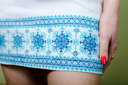 Ukrainian woman demonstrating beautiful details of embroidery ornament on vyshyvanka shirt. National costume - embroidered shirt, texture, design, folk, handmade craft needlework