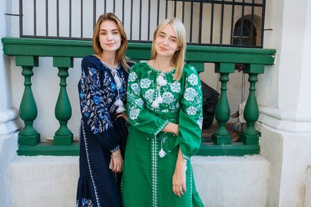 Kiev, Ukraine - July 18 2019: Two beautiful young girls in traditional dresses posing on the streets of Kiev.