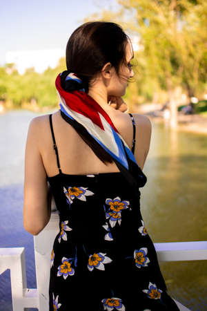 A shy girl is standing on a tropical summer in indecision.