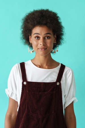 Black young woman in earrings posing and looking at camera isolated over blue background