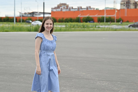 Portrait of a beautiful brunette girl in a blue dress on the street. Swedish Midsummer Festival