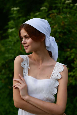 Woman in white dress countryside village nature ecology