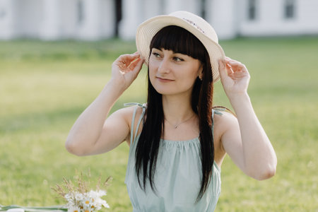 Beautiful relaxed European brunette woman in hat standing isolated on green grass background. Holidays concept.