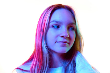 Close Up portrait of calm little girl, student in white looking away smiling isolated white background in mixed neon light, filter. Concept of beauty, human emotions, facial expression, youth. Ad