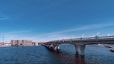 Beautiful cable-stayed bridge in St. Petersburg, Russia, with starry sky and cozy city lights
