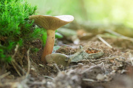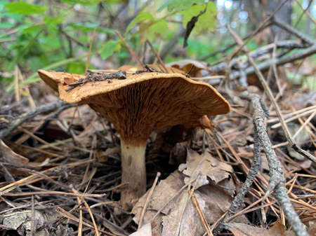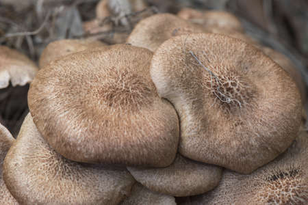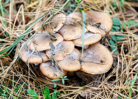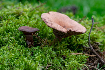 Mushrooms. Mushrooms in the forest. Closed full frame textured background of saffron hood mushroom growing in wild nature. Piece in a beautiful autumn forest. Group fungi. Autumn t