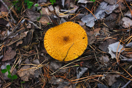 Detail of a mushroom, niscalo, of the forest floor in the middle of the mountain with pine leaves with brown, orange and green colors