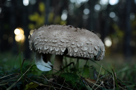 Parasol Mushroom (Macrolepiota procera) in a Forest at Sunset
