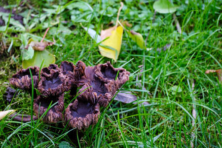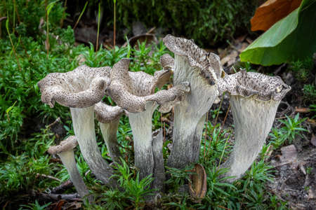 Group of amazing edible Craterellus cornucopioides mushrooms commonly known as horn of plenty or trumpet of dead. Czech Republic, Europe.