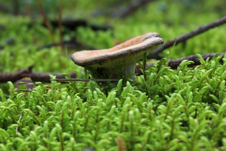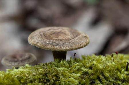 Small mushroom in a forest on green moss with dry leaves. Macro photo shoot of nature.