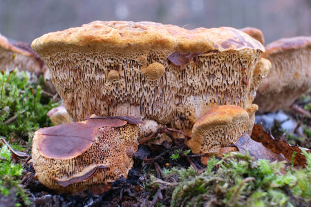 Mushrooms growing in the autumn forest on moss. Sarcodon imbricatus.