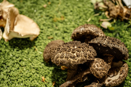 Harvested wild mushrooms displaying their textured caps and earthy tones, resting on green grass, suggesting a transition from nature to preparation or study