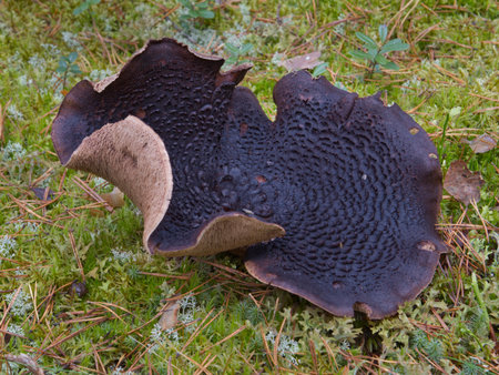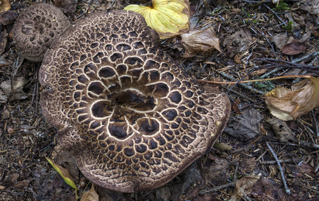 Patterns of a large Hawk's Wing mushroom in an Alaskan forest in fall.