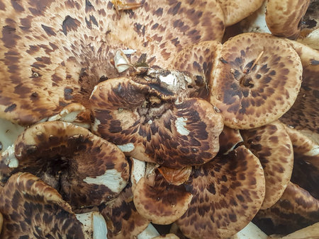 Lentinus tigrinus tiger sawgill Beautiful forest mushrooms with white cap and brown spots. organic natural