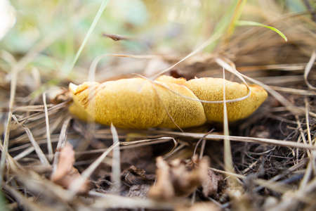 Macro of beautiful small red yellow turkey tail mushroom in autumn forest grass moss. View from top above. Fungus boletus in wood. Sunny day in country rural are.