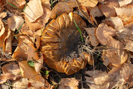 Brown large toadstool with interesting texture of mushrooms cap in tall grass in autumn light Latvian forest