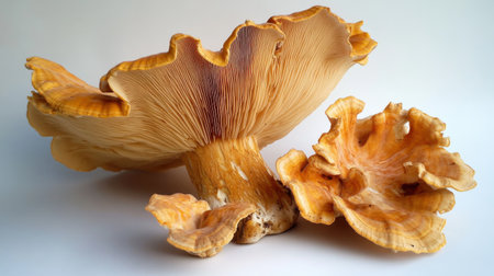 A close-up of two distinct orange mushrooms reveals their unique gill structure and irregular shapes, highlighting the beauty of fungi in nature.