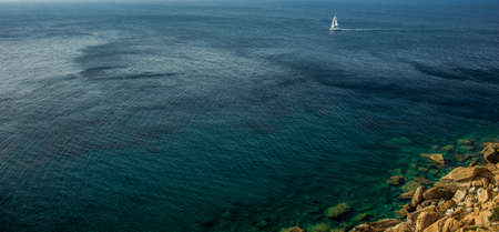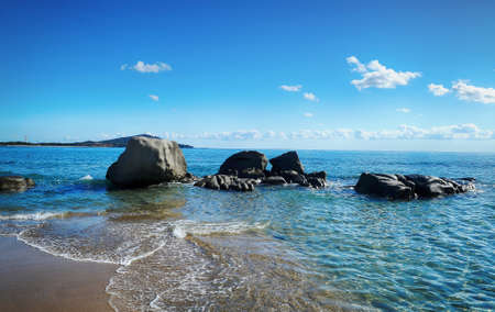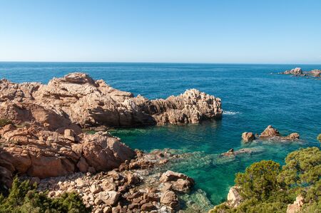 Rocky coast of the island of Sardinia in the Mediterranean Sea in sunlight in spring