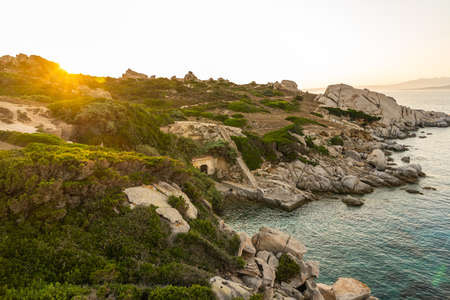 Landscape at Baja Sardinia luxury resort at sunset in the evening, Sardegna island in Italy in summer. Scenery in Olbia province. In the Mediteranean sea