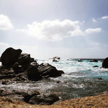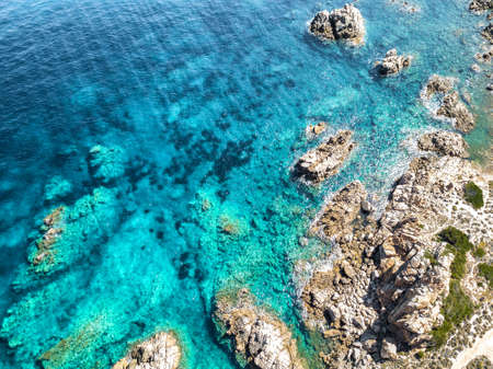 Summer seascape from above, showcasing a dramatic rocky shoreline and clear ocean water, great for travel brochures or beach-themed imagery.