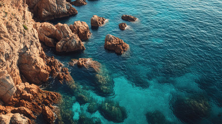 Aerial View of a Body of Water Surrounded by Rocks, Overhead view of a serene azure sea meeting a rocky coast, AI Generated