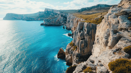 Stunning coastal cliffs and blue sea in a panoramic view, capturing the beauty of meeting point.
