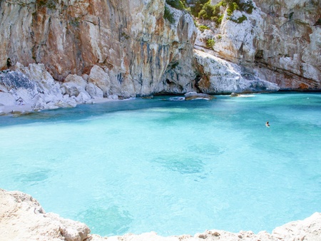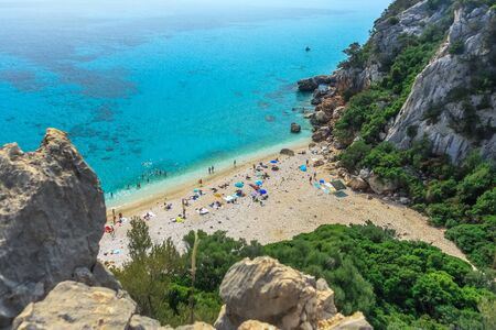 Cala Mariolu, Italy - 28 June 2013: people swimming and sunbathing at Cala Mariolu beach on Sardinia, Italy