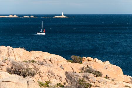 Boats in the Mediterranian Sea near mountains in Capo Testa in Santa Teresa Gallura, Sardinia, Italy. Ship and blue water.