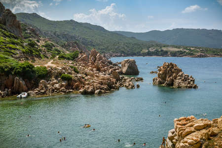 Costa Paradiso, Italy - August 30, 2019 - People swimming at Cossi beach near Costa Paradiso in Italy during sunny august day in 2019