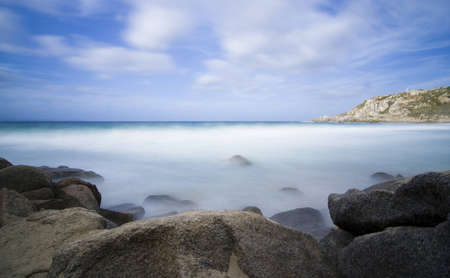 Long-Time Exposure of the Beach Rena Bianca of the town St. Teresa on a stormy summer day - Sardinia, Italy