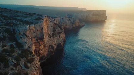 A stunning aerial view of a cliff by the ocean, where the fluid water meets the natural landscape, creating a picturesque and tranquil scene under the open sky AIG50