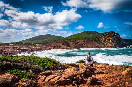 Man with backpack staring at the coast of Porticciolo - Sardinia in a windy day of autumn