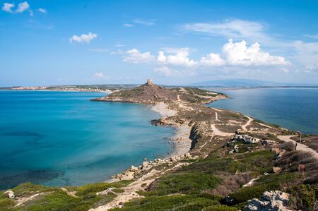 Landscape of the cliffs of Sant'Antioco with a watchtower and the turquoise sea on a sunny day