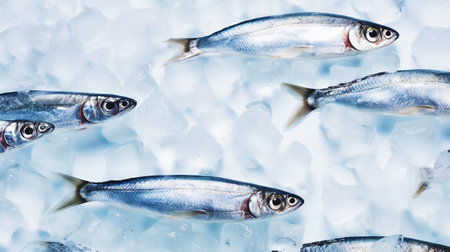 A group of fish sitting on top of ice. This image can be used to depict the effects of climate change on aquatic life or as a symbol of frozen food products.