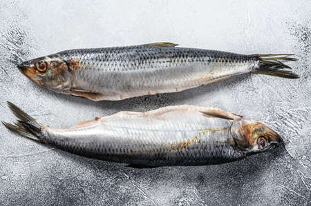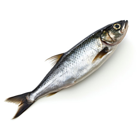 Fresh sardine resting against a clean white background, showcasing bright scales and delicate detailing. Concept of seafood, culinary arts, fish markets.