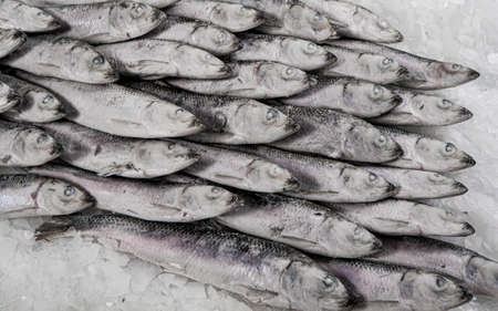 Fresh sprat folded on the ice. Winter fishing. Organic small fish production. Fish market. Close-up.